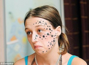 Belgian teenager, Kimberley Vlaminck said she went to sleep in a tattoo artist’s chair and woke up 56 stars later. She later recanted her story and said she had lied because her father was angry at her for the ink. But the impression remains.
